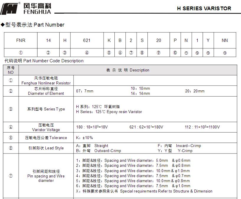 風華高科H系列壓敏電阻器型號命名規(guī)則: