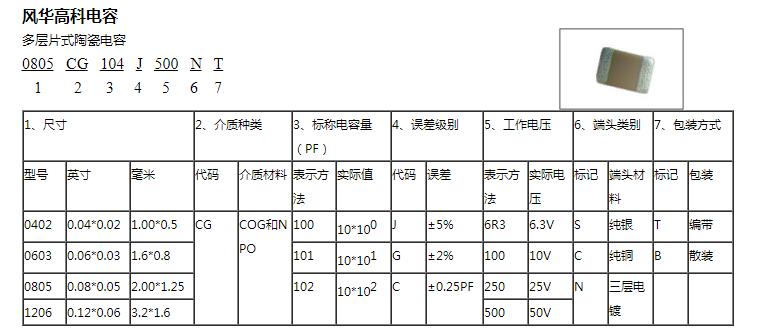 風華電容額定電壓表示方法:風華0805 CG 101 J 500 NT 如圖:第五部分為500為額定電壓;