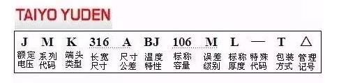 太誘貼片電容怎么看電壓:如圖太誘貼片電容型號JMK 316 A BJ 106 M L-T