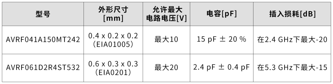 AVRF041A150MT242具有僅為0.4x0.2x0.2毫米的小尺寸,并提供ESD保護和2.4GHz頻段噪聲抑制。在2.4GHz下,最大插入損耗僅-20dB。AVRF061D2R4ST532的外形尺寸為0.6x0.3x0.3毫米,提供ESD保護和頻段高達5.3GHz的噪聲抑制。在該頻率下,插入損耗為-15dB。