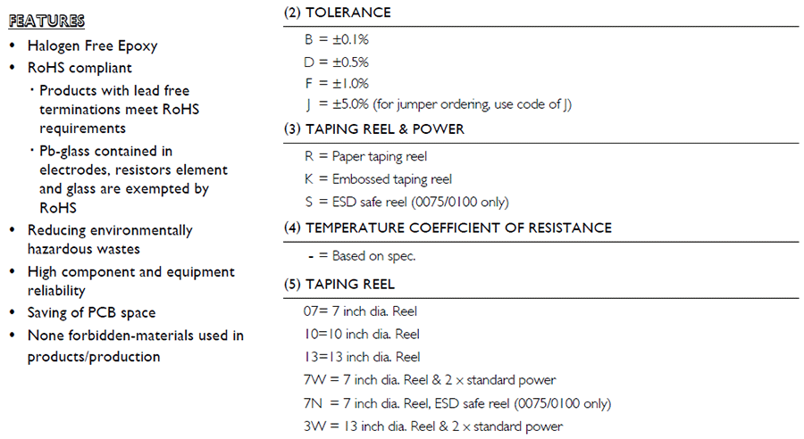 產品封裝:0075/0100/0201/0402/0603/0805/1206/1210/1218/2010/2512