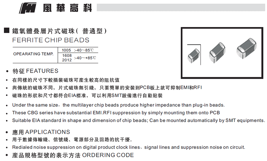 產(chǎn)品介紹:風(fēng)華CBG鐵氧體片式普通型磁珠